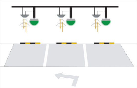 与此同时,停车场内指示灯亮红灯和绿灯的数据传送到控制中心,控制中心获知空车位的占用情况,并反映在动态车位指导屏上。驾驶者根据动态车位指导屏可以知道空余车位的数量,并按照指示前往具有空车位的停车区。